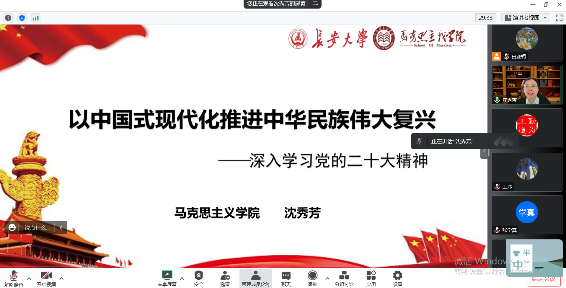 副教授沈秀芳,以《以中国式现代化全面推进中华民族伟大复兴——深入学习党的二十大精神》为题,从理论逻辑、历史逻辑和实践逻辑三个层面深刻阐释了中国式现代化的科学内涵和九大本质要求。结合宣讲内容,民建委员会长安大学主委钱会、民建委员会长安大学委员易秀、九三学社成员卢玉东、民盟委员会成员邓顺熙先后发言。大家一致表示要深入学习贯彻党的二十大精神,切实把党中央决策部署转化为学科建设和人才培养的新动力、新思路和新举措,发挥巴黎人赌场