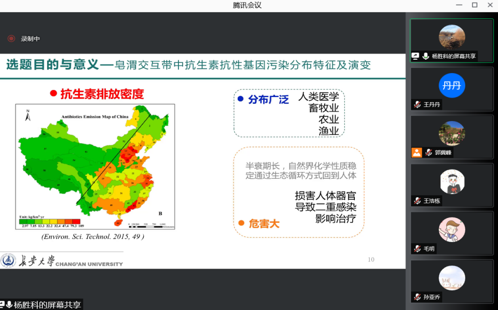 杨胜科教授首先详细阐述了抗生素、交互带、抗性基因的概念及分类,通过阐述研究现状指出目前环境领域的抗生素污染问题,指出抗性基因的潜在危害。他将核心研究问题“皂渭交互带中抗生素抗性基因污染分布特征及演变”分解成四个关键方面,即交互带中抗生素和抗性基因污染分布,环境因子、遗传元件和ARGs的相关性分析,交互带抗生素水解行为路径及水解产物研究和ARGs在交互带中动态变化模拟研究四个方面来进行详细讲解。最后,杨胜科教授提出未来可以通过实验多方验证,继续完善实验体系,进一步研究其机制。