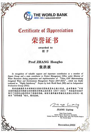 张洪波教授作为水利部世行项目咨询专家组成员,一直参与中国全球环境基金水资源与水环境综合管理主流化项目的技术咨询与研究工作。鉴于其积极作用和重要贡献,世界银行特发证予以肯定。而这标志着近年来巴黎人赌场