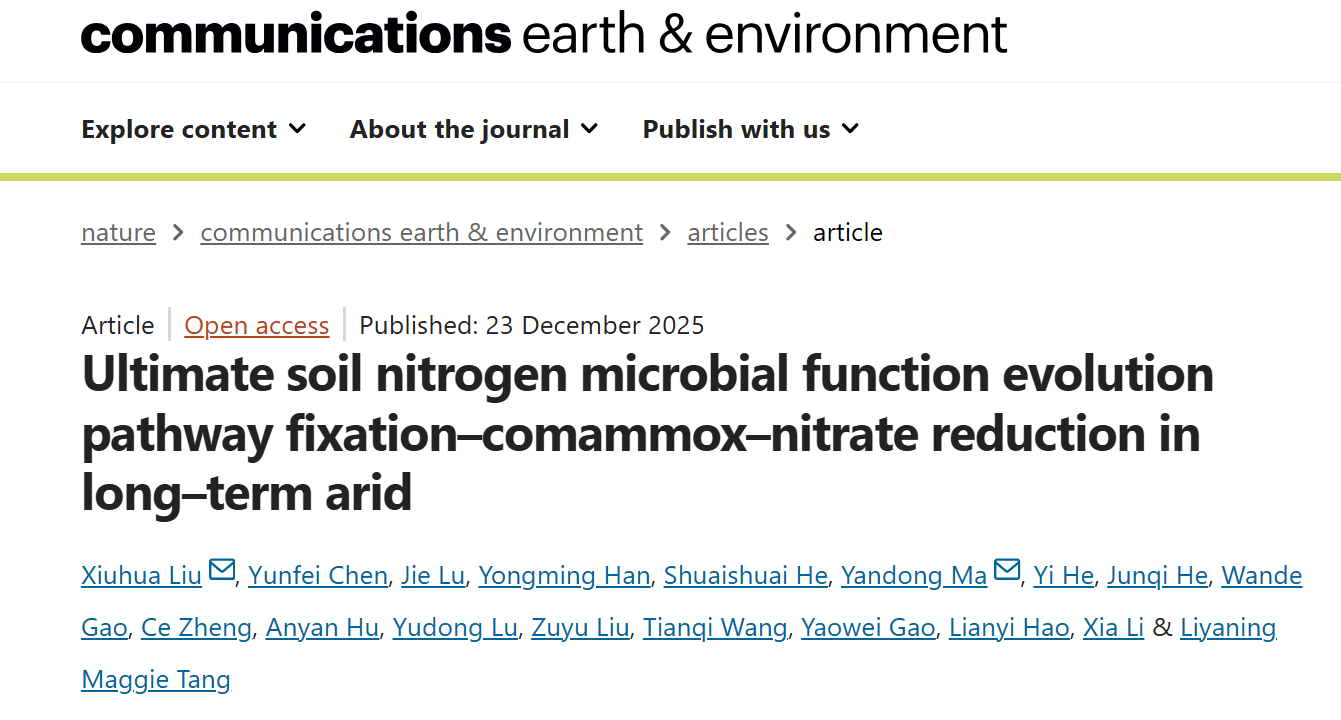 刘秀花教授团队在Nature子刊《地球与环境通讯》(Communications Earth & Environment)发表题为“Ultimate soil nitrogen microbial function evolution pathway fixation–comammox–nitrate reduction in long–term arid” 的最新研究成果。该成果首次证明:在长期干旱压力下,土壤微生物群落为适应氮素限制演化出一条独特的终极功能路径:固氮-完全氨氧化-硝酸盐还原循环。巴黎人赌场