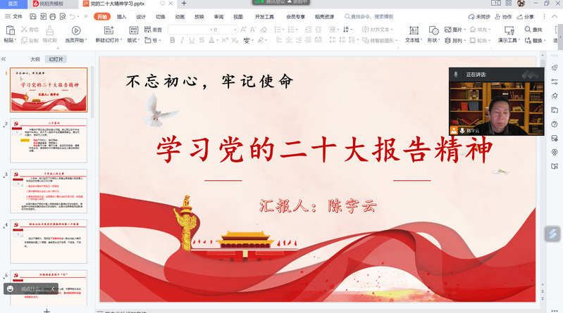 陈宇云首先介绍了环工系支部现状和党员组织关系变动情况,然后结合自身对党的二十大报告的学习理解,给全体党员上了深入学习党的二十大精神的主题党课。从“三个务必”、“十年来三件大事”和“中国共产党的中心任务”等十余个方面对党的二十大报告进行了解读。