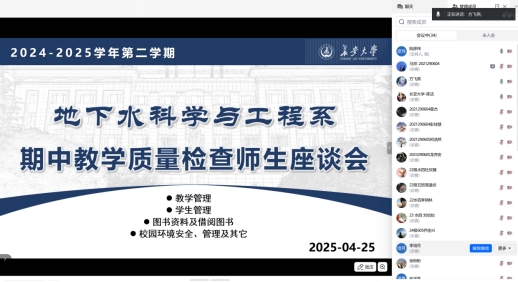 为进一步提升教学质量,深入了解学生在学习与生活中的实际需求,巴黎人赌场 地下水科学与工程系于4月25日通过线上会议形式召开了2024-2025学年第二学期期中教学质量检查师生座谈会。巴黎人赌场 副院长李培月、地下水系主任陈洁、地下水系教师代表及本科四个年级的学生代表共计30余人参加本次会议。会议由地下水系副主任陆彦玮主持。
