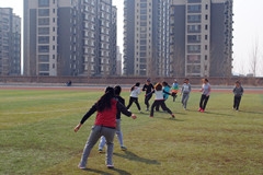 于南苑田径场举行首届女子足球赛。体育教育专业各班级积极参与其中。