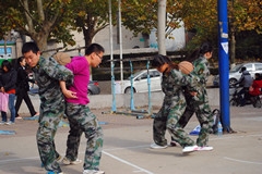 此次友谊赛共分为篮球比赛和篮球趣味项目两个环节。在篮球比赛中,男队员们个个雄姿英发,争锋相对;女队员们也巾帼不让须眉,抢球、运球、投篮动作潇洒利索,一点也不逊色与男生。比赛中场休息时,社团成员向在场的同学们展示了 “擒拿拳”等专业军事拳法,获得了阵阵掌声。接着成员们分成两个队参加了“背心球”活动,比赛中男女合作背靠背托球到终点返回,球掉落地一方算输。经过激烈的角逐,最终“梦之队”以绝对的优势战胜了“黄蜂队”获得了冠军。队员们在比赛结束后说:“他们今天玩的很high,希望多办几次像这样的活动,很期待下次活动的到来。”