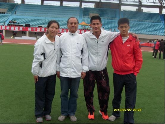 十九、获得女子乙组100m和200m两枚银牌的姜少霞同学(左)、获得男子乙组110m栏银牌和400m栏铜牌的李良杰同学(右一)与教练员李保安副教授(中)合影