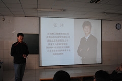 下午2:00报告会正式开始,首先上台演讲的是09级优秀毕业生张天玺。在热烈的掌声中,张天玺校友向大家介绍了自己创业方面的经历和渠道。他说自己成功的原因主要有两个方面:一个是性格,一个是坚持。性格上保持了一颗好奇心,永不甘于平淡的生活;行动上时刻拥有着坚持不懈的动力。张天玺表示:每个成功的人士都要经历不同的坎坷,但如何克服你所面临的困难最为重要,因为它决定着你是否能走向成功。“不是结束,而是开始”是张天玺校友赠予每一位在校学生的结束语,幽默诙谐的话语使整个会场气氛变得十分融洽。