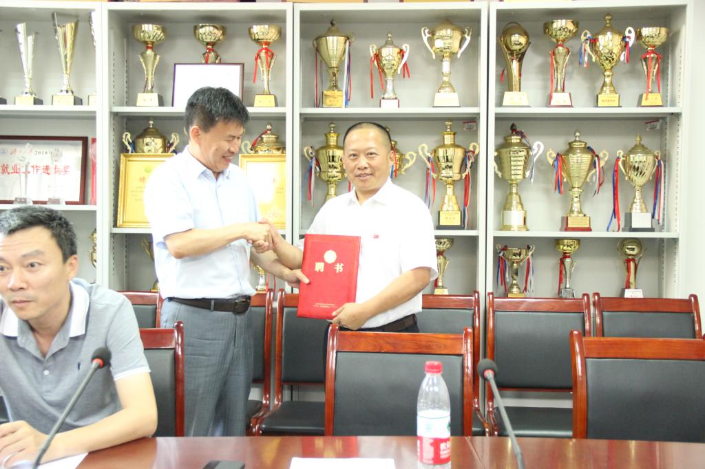 党委书记杨杰为山东省小球联合会主席修振涛颁发特聘教授聘书。